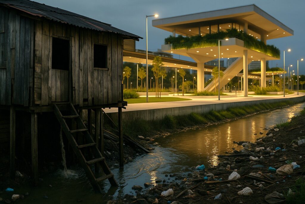 Na Belém que se prepara para receber a COP-30, há duas cidades. Uma delas brilha. É a cidade do Parque Linear da Nova Doca, um projeto de R$ 310 milhões que promete um “balé das águas” com fontes interativas, jardins suspensos e tecnologias de saneamento importadas de Singapura. Essa é a cidade vitrine, construída para impressionar o mundo. A outra, a poucos quilômetros de distância, afunda. É a cidade real de bairros como Terra Firme, Guamá e Jurunas, onde canais viraram esgotos a céu aberto e as chuvas anuais trazem um ciclo de perdas e doenças. A modernização, ao que parece, tem endereço certo, e a conta da maquiagem urbana para o megaevento está sendo paga pelos mais vulneráveis.