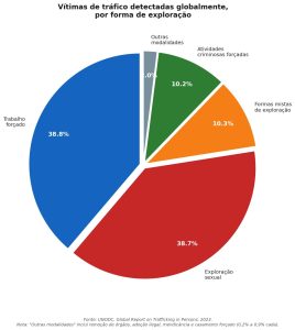 No plano global, o Escritório das Nações Unidas sobre Drogas e Crime (UNODC) identificou, em seu relatório de 2023, que o trabalho forçado responde por 38,8% das vítimas detectadas, seguido de perto pela exploração sexual (38,7%). Formas mistas de exploração somam 10,3%, e atividades criminosas forçadas, 10,2%.