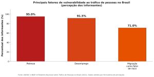 O III Relatório Nacional sobre Tráfico de Pessoas, elaborado pelo UNODC e pelo Ministério da Justiça e Segurança Pública (MJSP) em 2021, apurou que 95% dos profissionais que atuam no enfrentamento ao crime apontam a pobreza como principal fator de vulnerabilidade. O desemprego aparece em 91,5% das respostas, e a condição migratória em 71%.