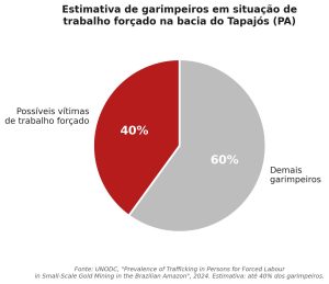 Na bacia do Tapajós, no Pará, um estudo específico da UNODC publicado em 2024 estima que até 40% dos garimpeiros podem ser vítimas de tráfico para trabalho forçado. O recrutamento segue um padrão: promessas de bons salários e alojamento que não se concretizam. A “servidão por dívida” aparece quando o trabalhador é induzido a contrair custos com transporte, alimentação e moradia, valores descontados de salários que nunca chegam a cobrir o débito.