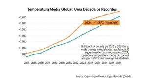 A década de 2015 a 2024 foi a mais quente já registrada. O aquecimento acelerado culminou em 2024, quando a temperatura média do planeta atingiu 1,55°C acima dos níveis pré-industriais.