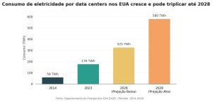 O crescimento de investimentos em infraestrutura de IA é o contexto. Segundo a agência Reuters, empresas de tecnologia planejam destinar cerca de US$ 635 bilhões a projetos ligados a IA em 2026, contra US$ 383 bilhões no ano anterior. O Departamento de Energia dos EUA estima que data centers consumiram 4,4% de toda a eletricidade do país em 2023 e podem chegar a uma faixa entre 6,7% e 12% até 2028.