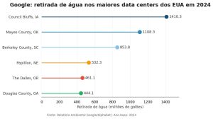 Dados publicados pelo Google mostram a dimensão do problema. O data center de Council Bluffs, em Iowa, retirou 1,41 bilhão de galões de água em 2024. O de Mayes County, em Oklahoma, retirou 1,1 bilhão. No total, as operações do Google consumiram 8,1 bilhões de galões no ano.