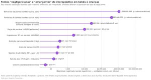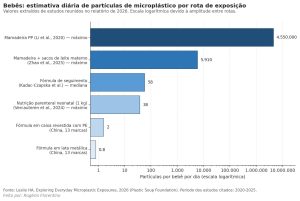 “Exploring Everyday Microplastic Exposures” estima que a ingestão de microplástico de um bebê alimentado com fórmula fique entre 23 e 104 partículas por dia, conforme o produto, o que corresponde a uma média de 6,9 partículas por quilo de peso corporal ao dia, ou cerca de 58 partículas diárias. Em 18 marcas de fórmulas de seguimento (para crianças de 6 a 12 meses), analisadas por Kadac-Czapska e colegas, todas as amostras apresentaram microplásticos, com mediana de 17,3 partículas por grama.