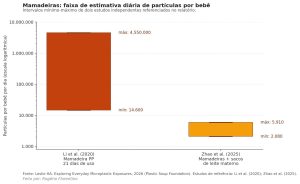 A higienização das mamadeiras com água quente está entre os fatores apontados pelo relatório como aceleradores da liberação de partículas. Em um experimento de 21 dias com mamadeiras de polipropileno, as paredes internas se degradaram e liberaram entre 14,6 mil e 4,55 milhões de partículas por bebê por dia, segundo estudo de Li et al. (2020) referenciado no documento. Em outra análise, a abertura e o fechamento 100 vezes de mamadeiras de alimentação e de água soltaram de 53 a 393 partículas por mililitro (Song et al., 2021).
