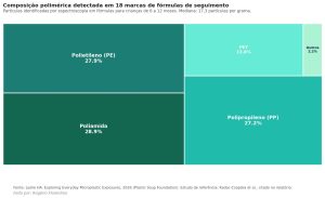 Os polímeros mais frequentes nessas fórmulas foram a poliamida (28,9% das partículas identificadas), o polietileno (27,9%), o polipropileno (27,2%) e o PET (13,8%). Uma pesquisa chinesa com 13 marcas, referenciada por Leslie, calculou que bebês que bebem fórmulas em caixas de leite revestidas com polietileno ingerem, no primeiro ano de vida, cerca de 580 partículas por ano, contra 305 partículas por ano entre os alimentados com fórmulas em latas metálicas.