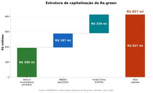 A empresa levantou R$ 390 milhões em rodada Série A com investidores como Gávea Investimentos (gestora de Armínio Fraga), o family office da família Moreira Salles, Dynamo, BW Capital, Lanx Capital, Principia Capital e Guilherme Leal, cofundador da Natura. Em financiamento público, obteve mais de R$ 437 milhões junto ao BNDES — R$ 187 milhões contratados em janeiro de 2024 e R$ 250 milhões via Fundo Clima, anunciados durante a COP30, em Belém. Uma operação de R$ 80 milhões para restauração na Mata Atlântica recebeu a nota “Verde Escuro” da S&P Global Ratings, a mais alta da metodologia Shades of Green.