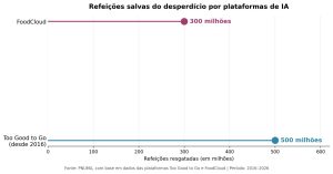 Fonte: Artigo “Colhendo os frutos do dividendo digital: as soluções de IA que ajudam a reduzir o desperdício alimentar pela metade”. Programa das Nações Unidas para o Meio Ambiente (PNUMA), Nairóbi, 28 de março de 2026. Dados compilados a partir de informações das plataformas Too Good to Go, FoodCloud, Mill e Winnow, e de pesquisas do PNUMA sobre impacto ambiental da IA (Issues Note, setembro de 2024) e resolução UNEP/EA.7/L.14 da UNEA-7 (dezembro de 2025). Disponível em: https://www.unep.org/pt-br/noticias-historias-e-discursos/historia/colhendo-os-frutos-do-dividendo-digital-solucoes-de-ia-que. Licença: uso educacional e não comercial com crédito à fonte.