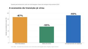 O custo do armazenamento em baterias caiu 93% desde 2010. O solar fotovoltaico recuou 87% e a eólica em terra, 55%. A média global ponderada do preço de sistemas de armazenamento em baterias chegou, segundo a BloombergNEF citada pela Irena, a cerca de US$ 140 por quilowatt-hora, o menor patamar já registrado na série histórica do levantamento. Em 2025, o mundo adicionou cerca de 247 GWh de capacidade de armazenamento em baterias, quase o dobro do registrado em 2024.