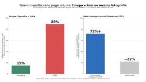 A China tem apenas 4% do mix elétrico atado a petróleo e gás, contra 40% a 50% em boa parte das demais economias asiáticas. As renováveis atenderam cerca de 80% do crescimento da demanda elétrica chinesa em 2024, e mais da metade dos carros novos vendidos no país são elétricos.