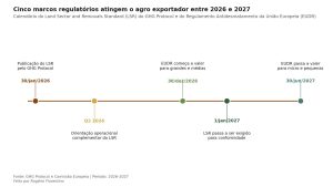 A exigência climática do GHG Protocol se soma a outra pressão vinda da Europa. O regulamento antidesmatamento da União Europeia (EUDR) passa a valer em 30 de dezembro de 2026 para grandes e médias empresas e em 30 de junho de 2027 para micro e pequenas. Ele exige geolocalização dos talhões onde foram produzidas commodities como soja, café, cacau, borracha, óleo de palma, madeira e gado, além da comprovação de que não houve desmatamento após 31 de dezembro de 2020.