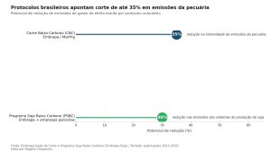 A Embrapa trabalha com dois protocolos voluntários que podem virar vantagem competitiva. O Programa Soja Baixo Carbono (PSBC), com apoio de Bayer, Bunge, Cargill, Coamo, Cocamar, GDM e UPL, prevê certificação privada de terceira parte e aponta potencial de redução de emissões da ordem de 30% com práticas sustentáveis recomendadas. O protocolo Carne Baixo Carbono (CBC), desenvolvido em parceria com a Marfrig desde 2018, indica redução de até 35% na intensidade de emissões, já conta com quatro certificadoras credenciadas e usa a plataforma Agri Trace Animal, da Confederação da Agricultura e Pecuária do Brasil (CNA), para rastreabilidade.