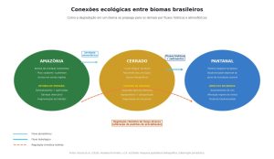 A análise concentra-se em Amazônia, Cerrado e Pantanal — não como unidades independentes, mas como peças de um sistema integrado. A floresta amazônica funciona como bomba de umidade continental. A evapotranspiração da floresta gera massas de ar úmido que se deslocam milhares de quilômetros e sustentam o regime de chuvas de outras regiões. Quando o desmatamento reduz essa evapotranspiração, a formação de nuvens diminui, os padrões de precipitação se alteram e a umidade do solo cai em áreas distantes.