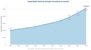 Fonte: Relatório “Renewable Capacity Statistics 2026”. Série: Renewable Capacity Statistics (anual). Julian Prime et al. Agência Internacional de Energia Renovável (IRENA), Abu Dhabi, 2026. Dados de capacidade instalada de geração de eletricidade a partir de fontes renováveis, período 2016–2025, compilados a partir de questionários IRENA, estatísticas oficiais nacionais, Eurostat e AIE. ISBN: 978-92-9260-725-8. Disponível em: www.irena.org/Publications. Licença: © IRENA 2026 (uso livre com atribuição).