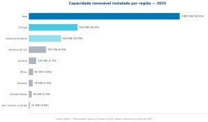 A Ásia concentra a maior capacidade instalada: 2.890 GW ao final de 2025, mais da metade do total mundial. Em seguida vêm Europa (934 GW), América do Norte (618 GW), América do Sul (332 GW), África (82 GW) e Oceania (76 GW).