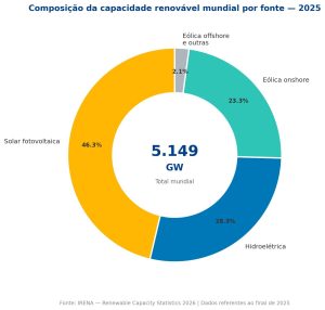As fontes de energia renovável atingiram 49% de toda a capacidade de geração de eletricidade instalada no mundo ao final de 2025, segundo o relatório “Renewable Capacity Statistics 2026”, da Agência Internacional de Energia Renovável (IRENA). O estoque global de renováveis chegou a 5.149 gigawatts (GW), após a adição recorde de 692 GW em 12 meses — resultado da queda contínua nos custos de painéis solares e turbinas eólicas, combinada com políticas de incentivo em grandes economias. A energia solar fotovoltaica concentrou o grosso desse avanço, com 510 GW instalados no período.